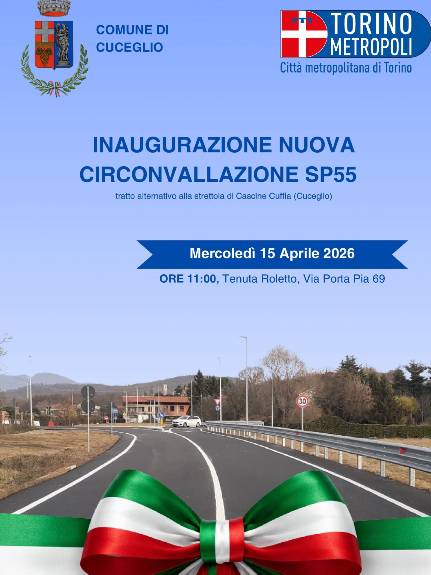 Descrizione Inaugurazione nuova circonvallazione SP55Mercoledì 15 aprile 2026ore 11:00, Tenuta Roletto, Via Porta Pia 69 A cura di Segreteria Letzte Änderung: 10.04.2026 09:11:14